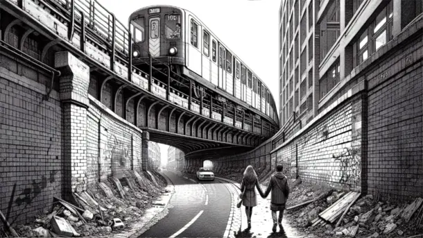 Die zwei zögern nicht, sie leben in der Situation. Sie haben keine Vergangenheit außer der letzten Stunden, sie haben keine Zukunft, die weiterreicht als wenige Minuten. Sie werden sich gleich den Takt der Stadt machen. Im Schutze der Hochbahnmauer klammern sich die beiden. Sie gießen an diesem Wochenende das Benzin in den Tank der Freiheit, um sich ihren Begierden hinzugeben und sich ihr dann zu entledigen.