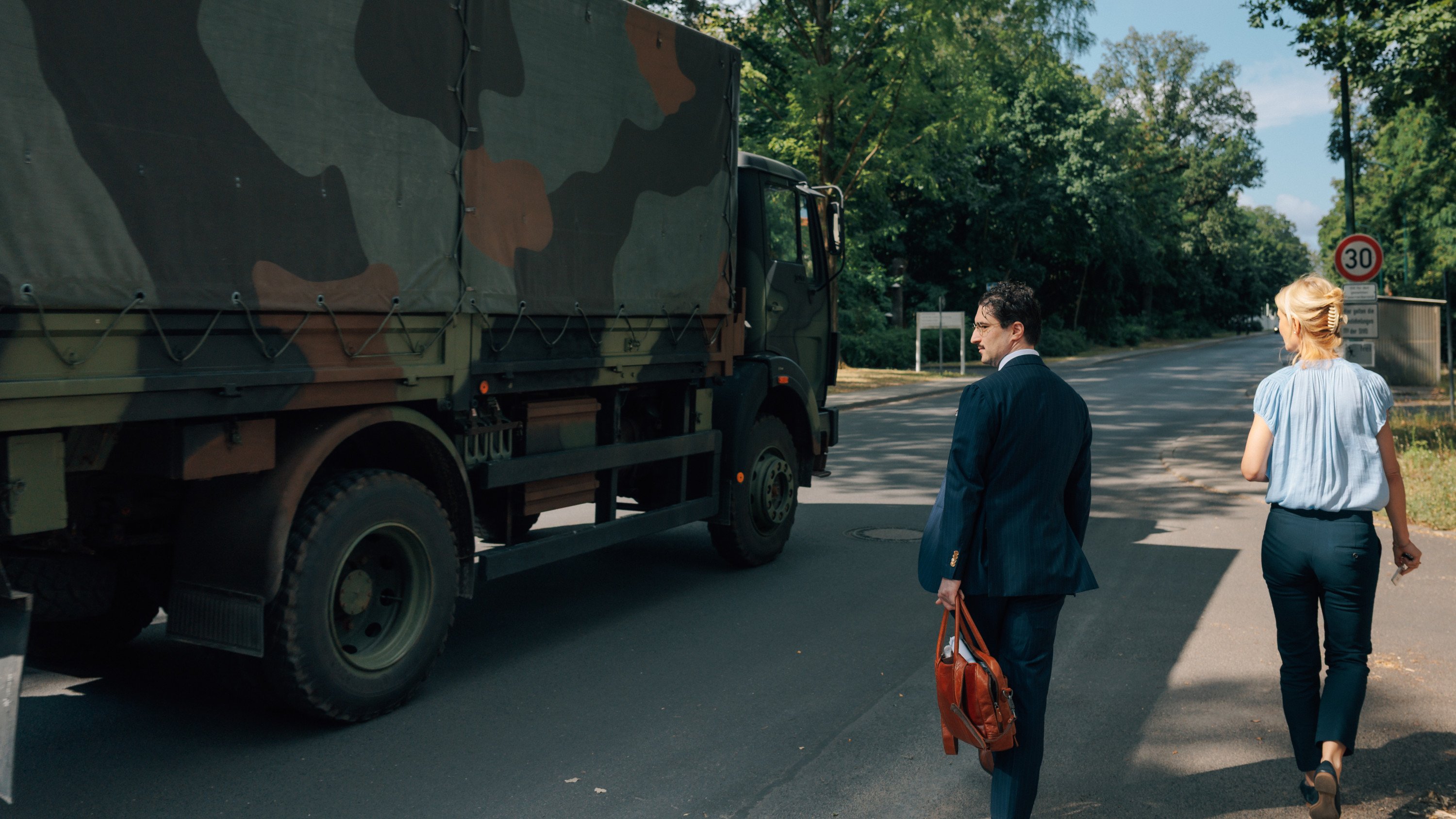 - Alt-Text: Patrick Pehl in der Julius-Leber-Kaserne, links fährt ein militärischer Lastwagen.