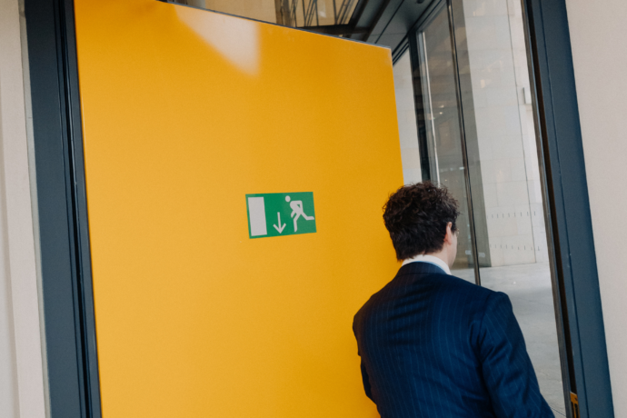 Patrick Pehl geht durch den Notausgang im Reichstagsgebäude – Max Hartmann